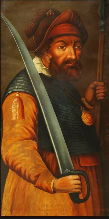 Портрет Ермака Тимофеевича написан в 1583 году, он уже съездил в город Москву и получил рыцарские латы за строительство крепости Новохолмогоры, купец Аника Строганов, поставлявший строганину в крепость Новохолмогоры быстренько подсуетился и привёз свою старшую дочь Вассу Аникеевну, чтобы выдать замуж за Ермака Тимофеевича, так что мы видим и рыцарские латы Ермака Тимофеевича, пиратскую серьгу на ухе, Русские историки решили по серьге, что Ермак атаман, нет он был почти пиратом - Мещёрским Татарином на ладьях и ездил везде на ладьях от Москвы до Новохолмогор и обратно.