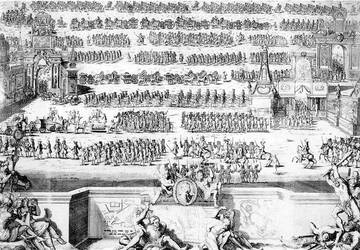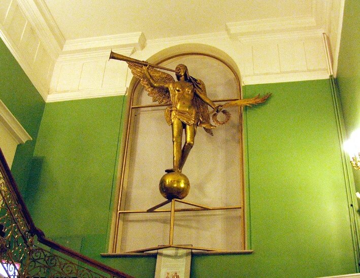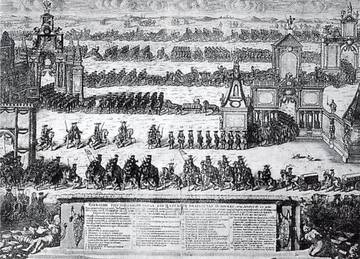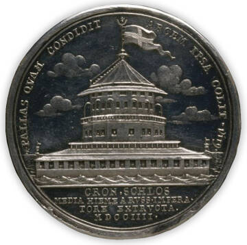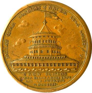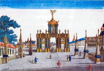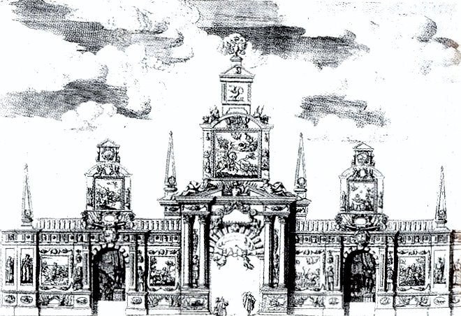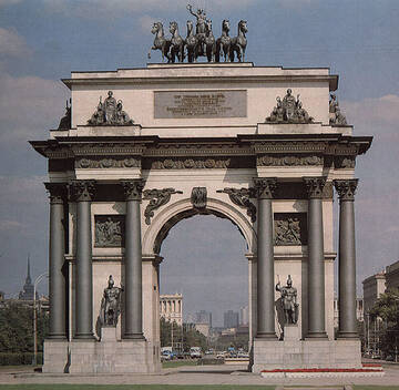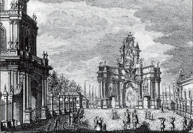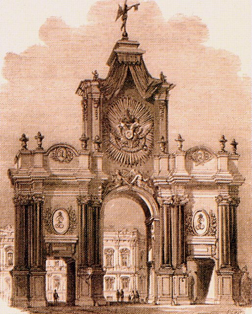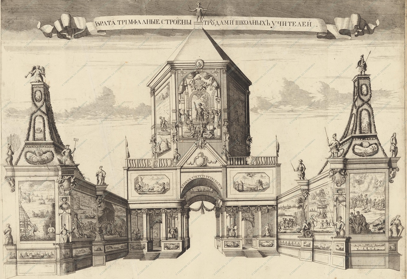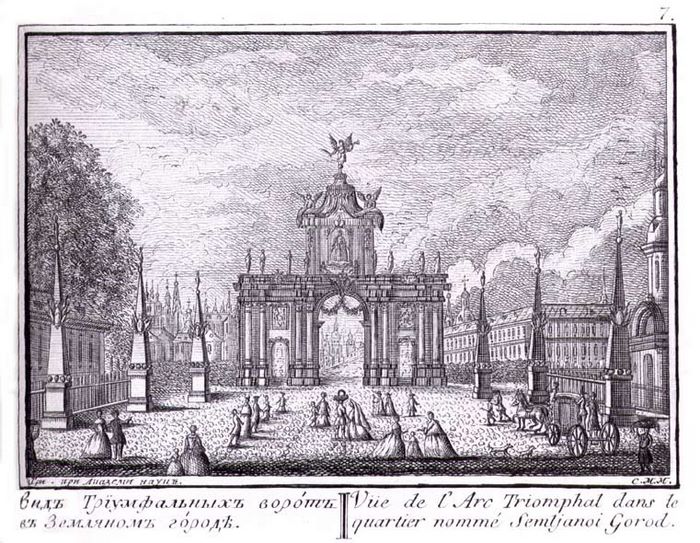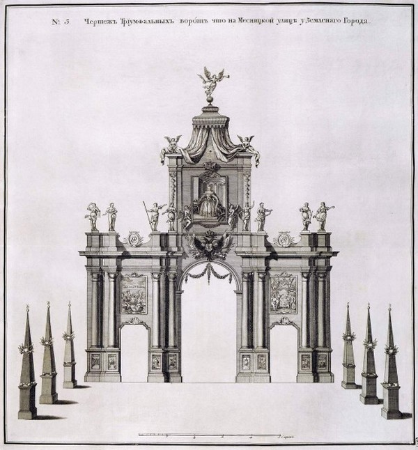 При входе на каменный мост построены были триумфальные ворота, образом древних Римских торжественных ворот, с следующими украшениями: на правой стороне оных на пьедестале статуя Марсова, имеющая в правой руке меч, в левой щит с надписью: Марсовою храбростью; у ног его невольники, татарский Мурза с луком и колчаном, а за ним два Татарина скованные ... На левой стороне статуя Геркулесова на таком же пьедестале, держащая в правой руке обыкновенную его палицу, а в левой ветвь зеленую с надписью Геркулесовою крепостью. У ног его лежал паша Азовский в чалме и два скованные Турка <...>."