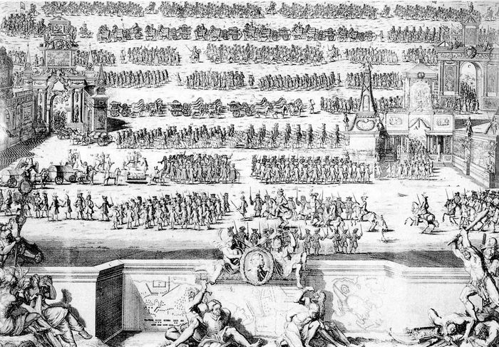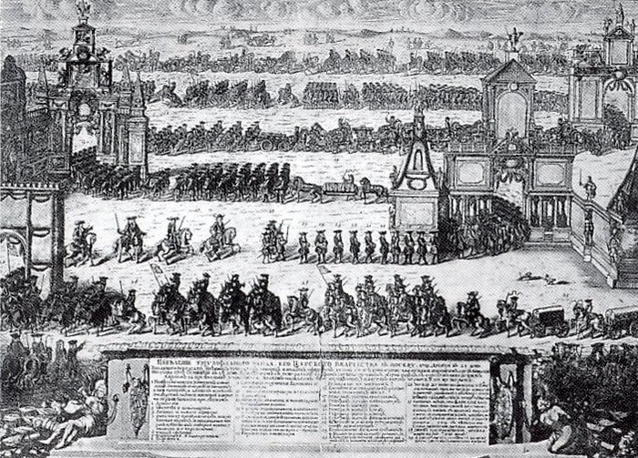 В Москве царя-победителя ждал торжественный прием. При въезде на Всесвятский каменный мост из Замоскворечья была сооружена десятиметровая Азовская триумфальная арка, через которую в пешем порядке прошли все русские полки. По своду арки шла надпись — цитата Юлия Цезаря: «Пришел, увидел, победил». Стены украшали барельефы с эпизодами осады Азова."