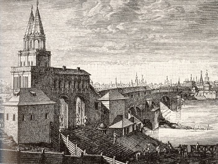 Вид на Большой Каменный мост из Замоскворечья. Гравюра 18 века.