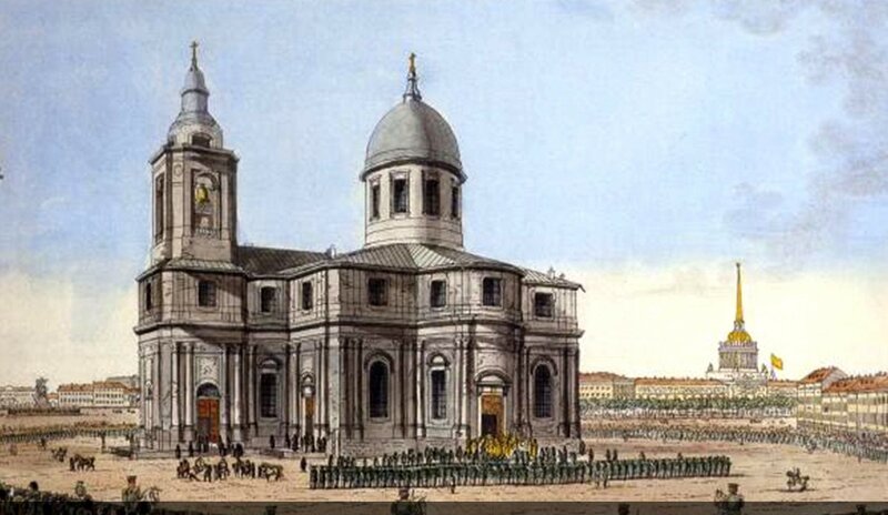 Для храма выбрали место на 80–90 метров западнее Адмиралтейства, в 20–25 метрах от Невы. Петр хотел украсить Питер с Невы. Т.е. церковь стояла там, где сейчас стоит памятник Петру - "Медный всадник" (который совсем не медный)."