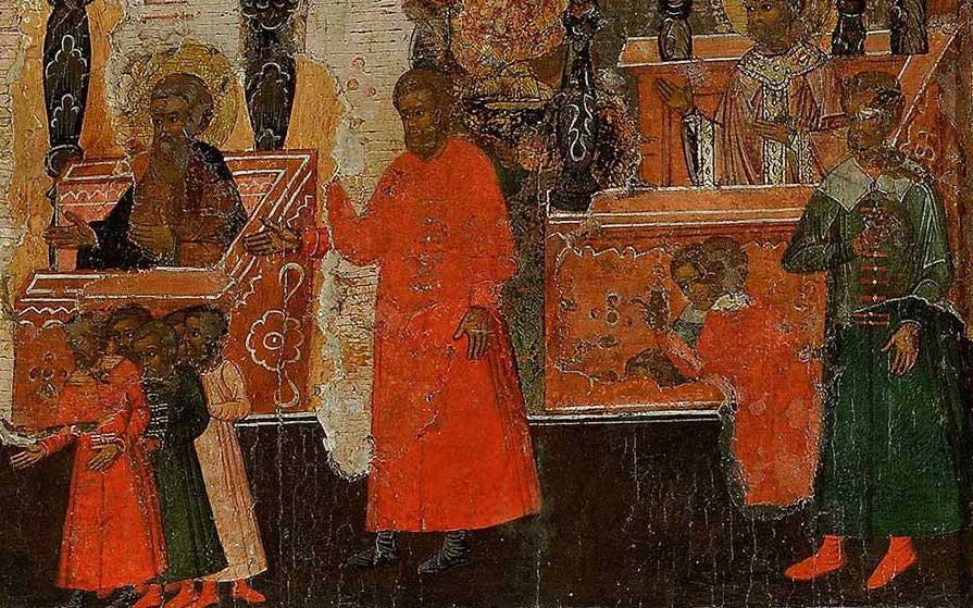 «Изображение семьи Строгановых на иконе "Иже херувимы". Справа с рукой на груди изображён Никита Григорьевич Строганов, вкладчик иконы. Посередине стоит Семён Аникеевич перед Симеоном Столпником».