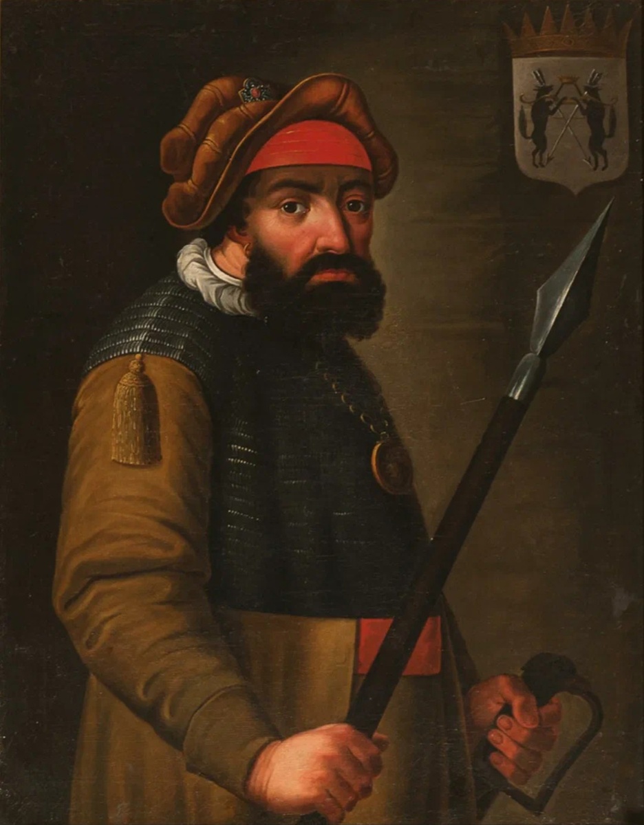 Первый портрет был написан в 1583 году, Ермак Тимофеевич только женился, ему уже подарили рыцарские латы от царя Ивана Грозного за руководство строительством крепости Новохолмогоры.