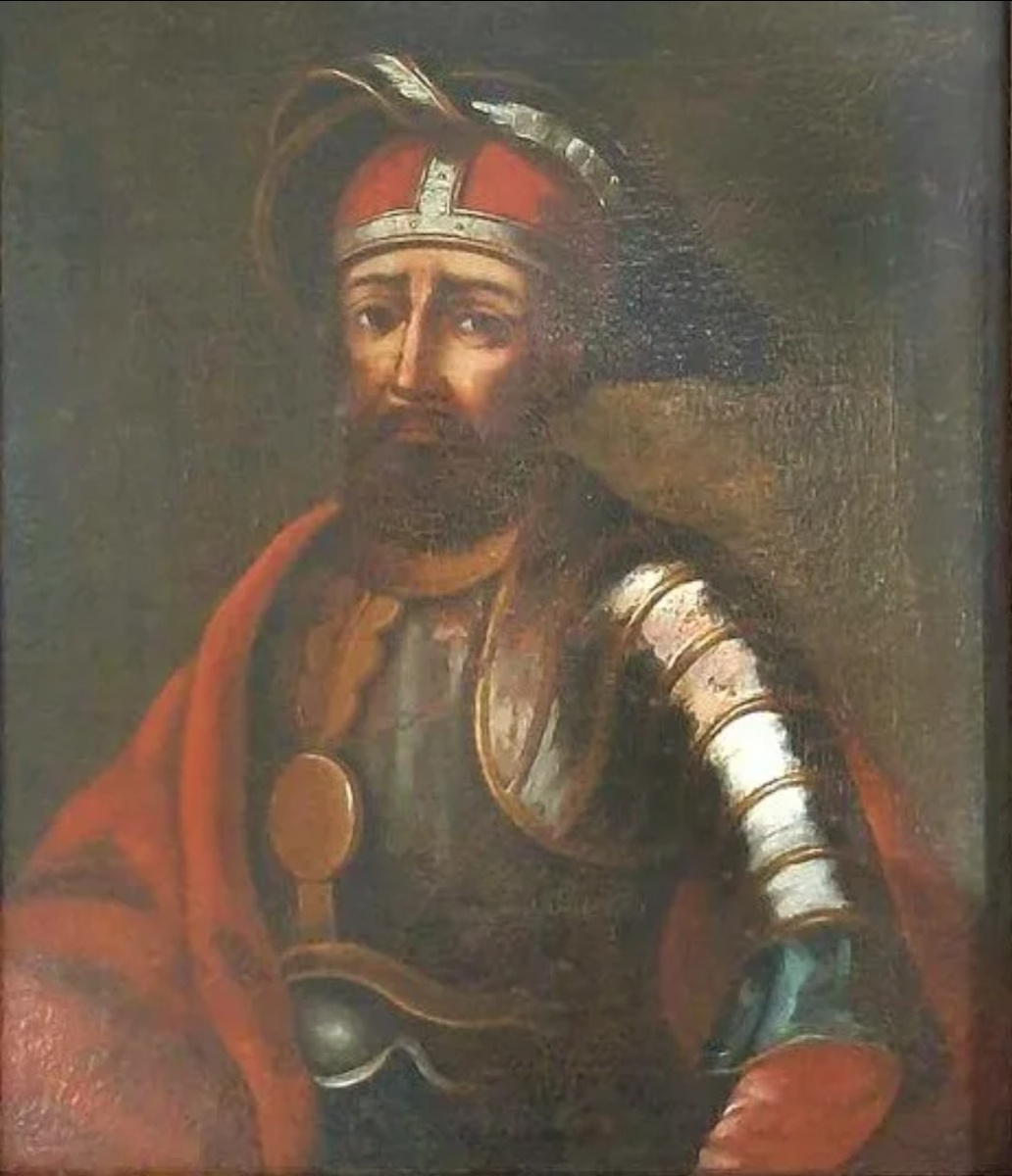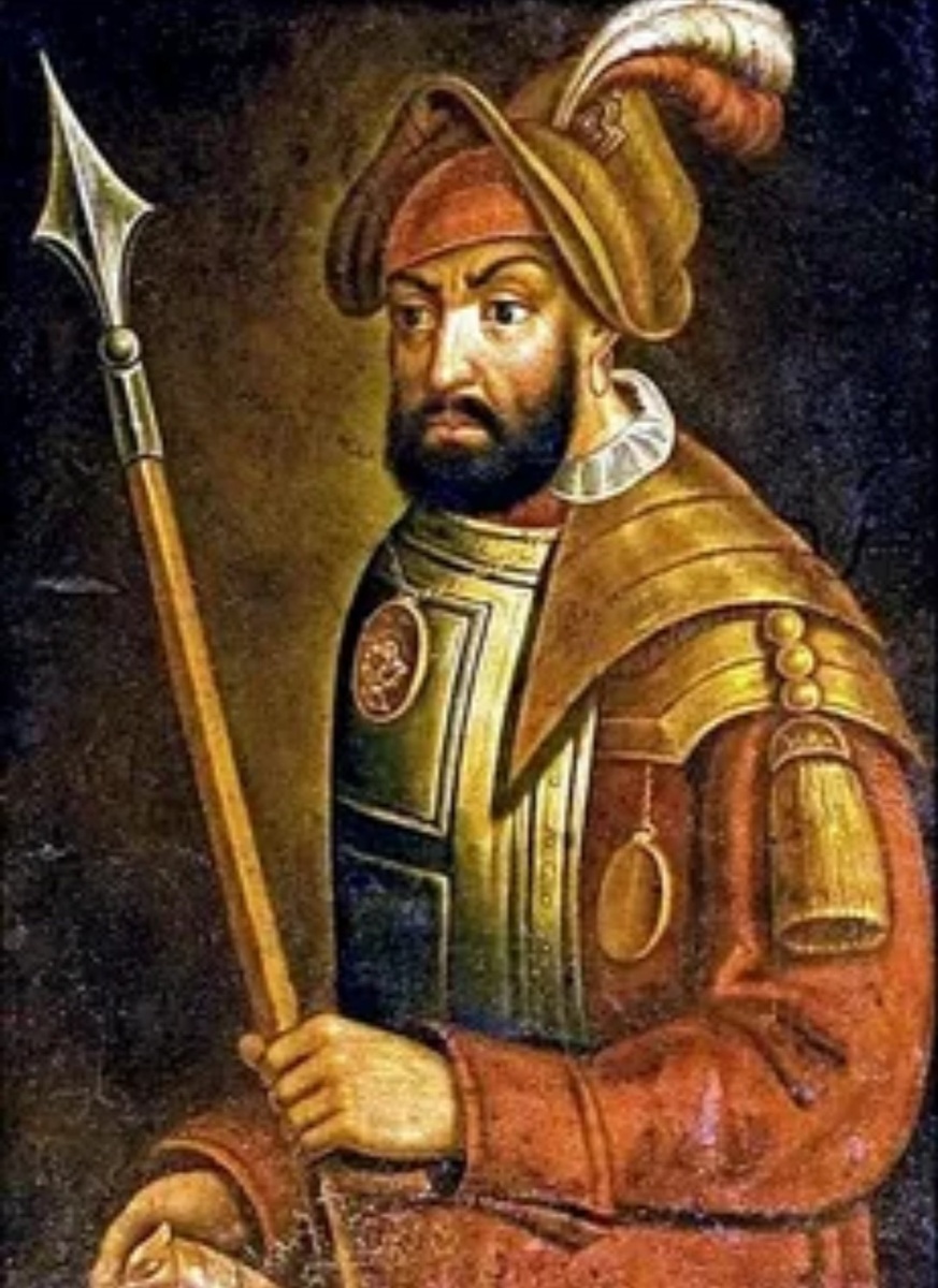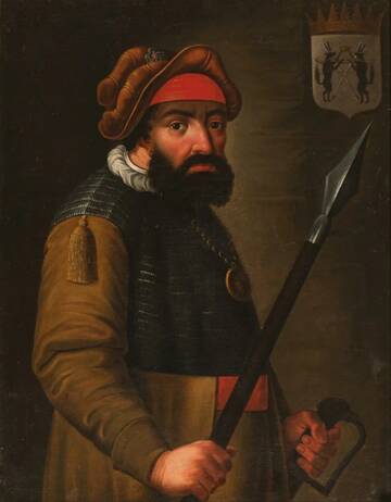 Портрет Ермака Тимофеевича написан в 1583 году, он уже съездил в город Москву и получил рыцарские латы за строительство крепости Новохолмогоры, купец Аника Строганов, поставлявший строганину в крепость Новохолмогоры быстренько подсуетился и привёз свою старшую дочь Вассу Аникеевну, чтобы выдать замуж за Ермака Тимофеевича, так что мы видим и рыцарские латы Ермака Тимофеевича, пиратскую серьгу на ухе, Русские историки решили по серьге, что Ермак атаман, нет он был почти пиратом - Мещёрским Татарином на ладьях и ездил везде на ладьях от Москвы до Новохолмогор и обратно.