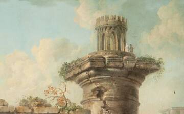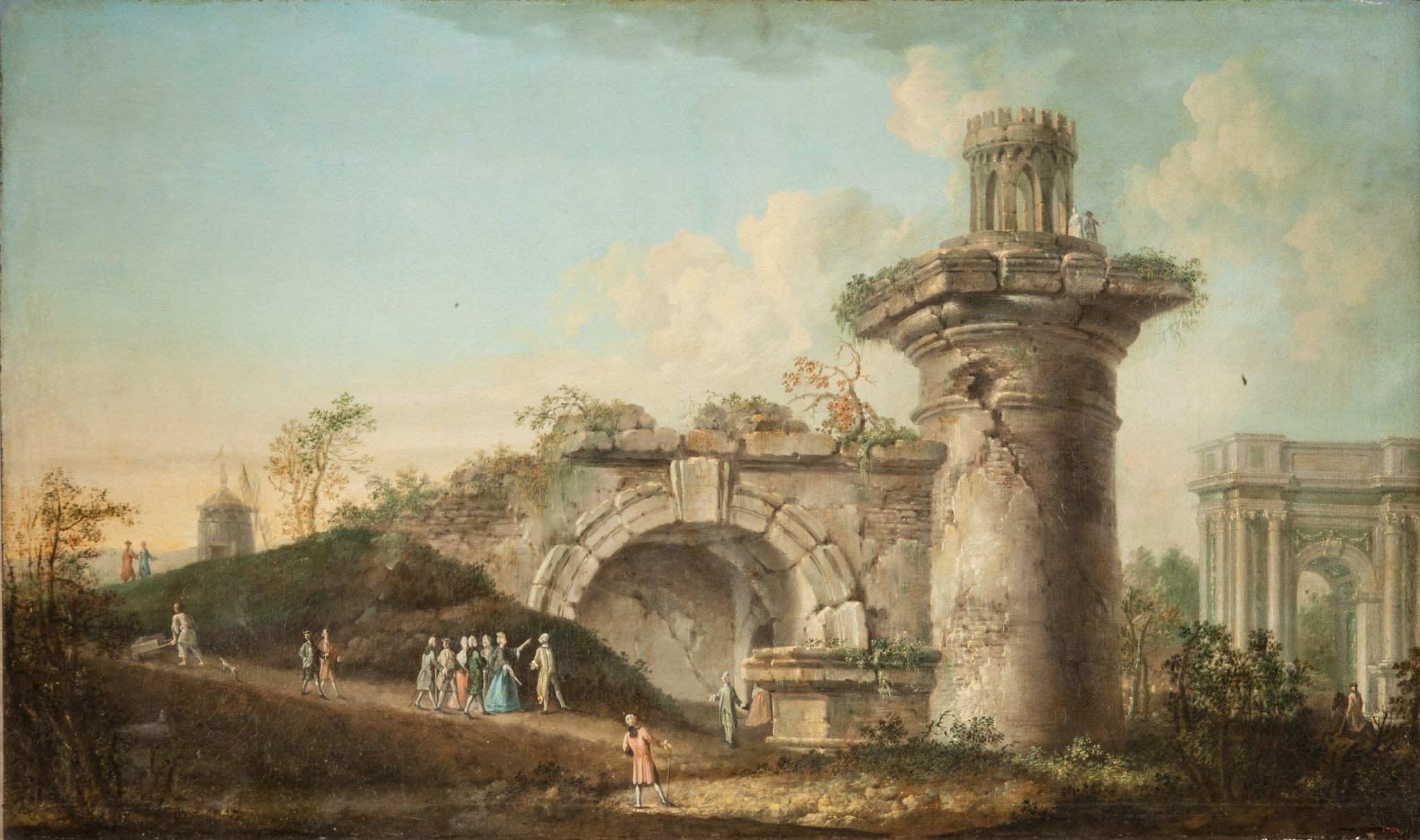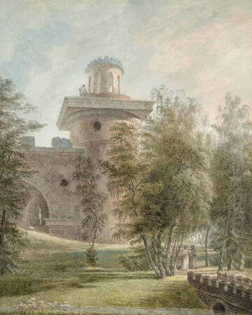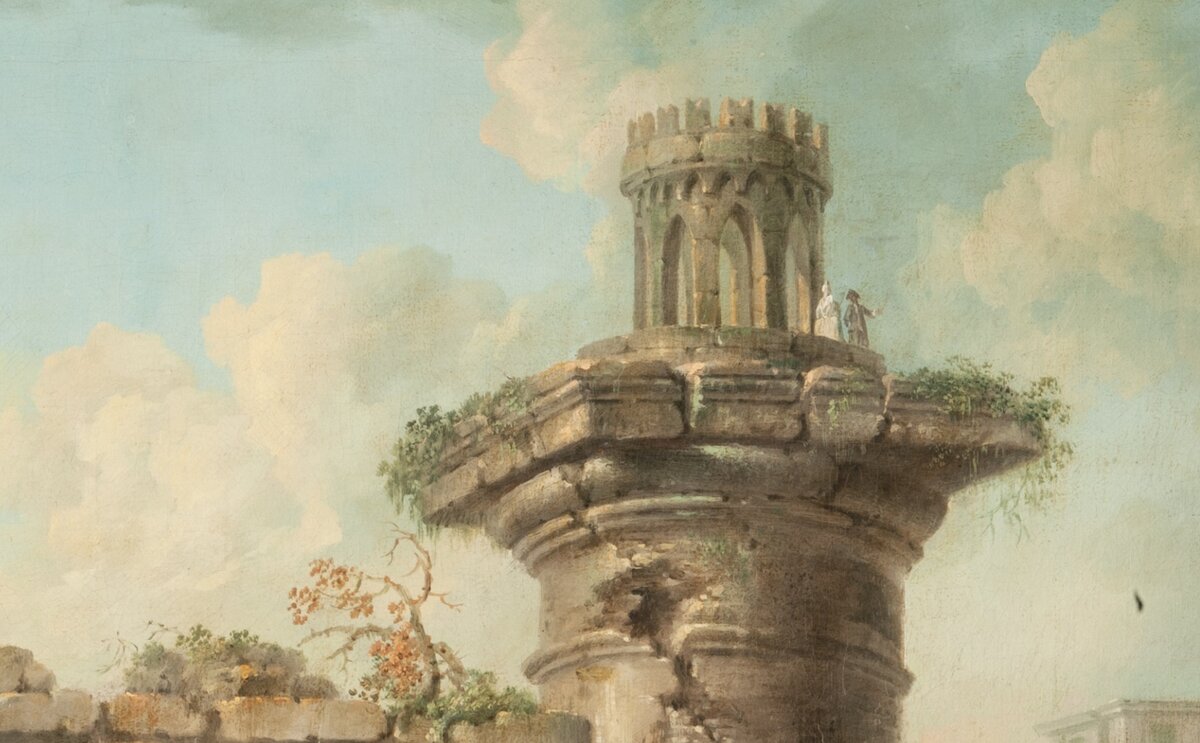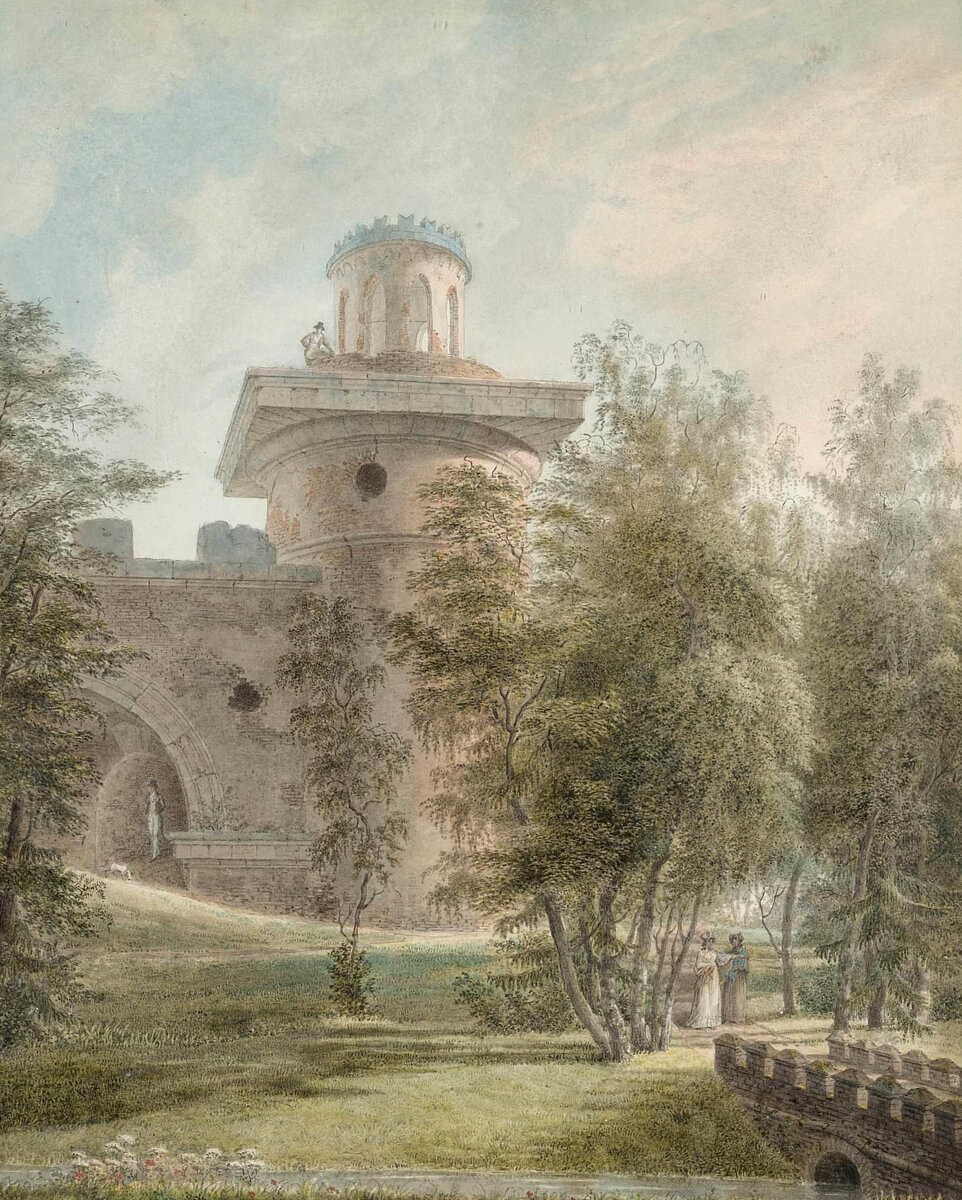 «Заглянем в историю этой картины. Её написал французский художник Юбер Робер, который никогда не был в России. «Башня-руина в Царском Селе» была написана им по заказу Екатерины II и по зарисовкам графа А. С. Строганова. Граф послал мастеру для образца собственноручную зарисовку сооружения с подписью по-русски: «П.[писал] Жив [живописец] Робертъ въ Париже 1783».