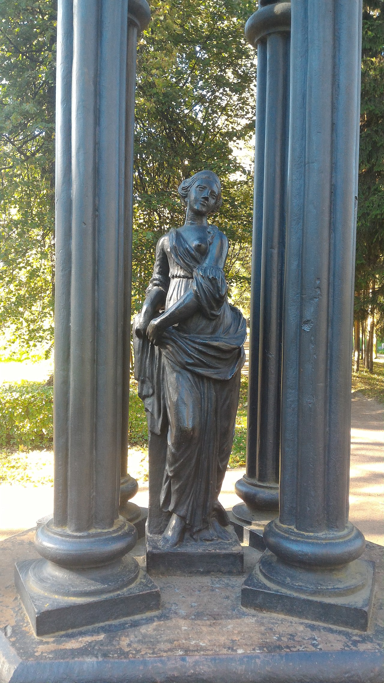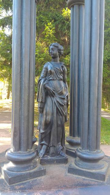 «Башня-руина была возведена в южной части парка по повелению императрицы Екатерины II по проекту архитектора Ю. М. Фельтена в 1771—1773 году в честь побед русской армии в русско-турецкой войне 1768—1774 годов. Памятник был задуман как остатки старинной турецкой крепости, состоящей из гигантской башни и части крепостной стены, прорезанной аркой, с системой оборонных устройств. Стена с аркой переходит в земляную насыпь со склонами, покрытыми кустарниками и деревьями. На замковом камне, венчающем арку башни-руины, высечена надпись: «На память войны, объявленной турками России, сей камень поставлен ҂аѰѮИ года» где номер года дан в допетровском стиле буквами старой кириллической записи, трактуемой как 1768 [год].