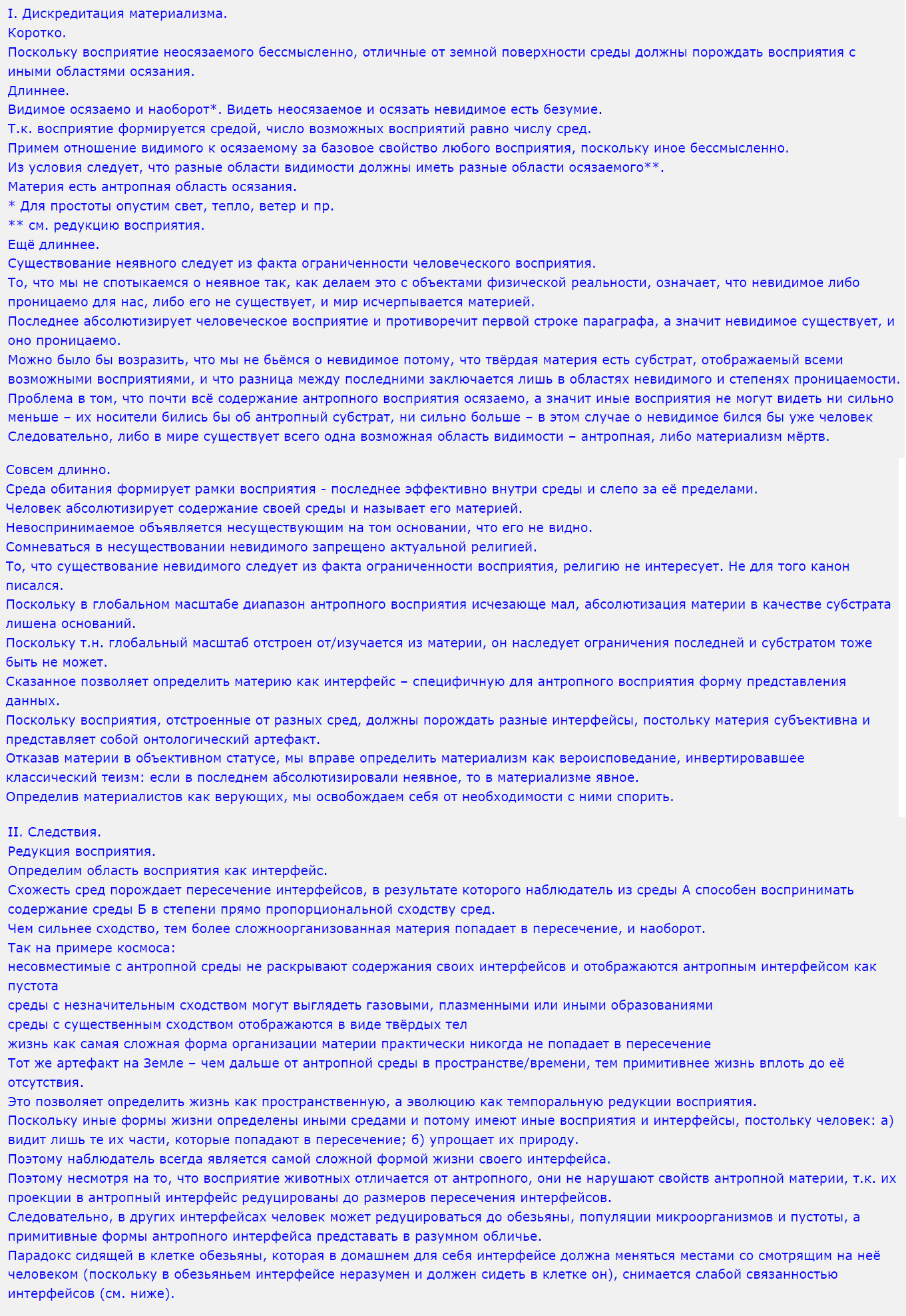 Автор сам себя лишает права на дискуссию последней фразой: «Определив материалистов как верующих, мы освобождаем себя от необходимости с ними спорить».Это классический прием иммунизации гипотезы. Объявив оппонентов «верующими», автор уходит от необходимости доказывать свою теорию эмпирически. Однако его собственная теория — о множественности миров и редукции восприятия — построена исключительно на вере в то, что его логические построения верны. По сути, это попытка создать метафизическую систему, маскирующуюся под научную критику материализма.