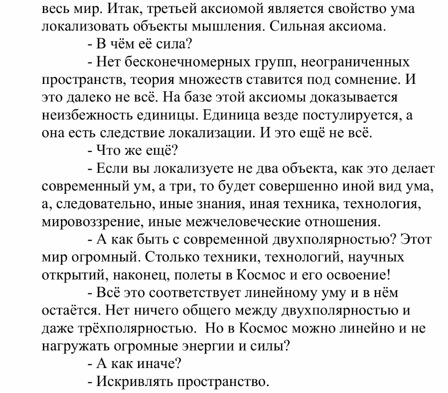 По сути локальность мышления означает совершенно иной подход к тому, что в христианстве названо "жизнь по плоти" и "жизнь по духу". Тот" Абсолют", Бог, Который представляется "Вечным, Вездесущим, Всемогущим" становится качеством мышления конкретного человека и описывается довольно просто локой мышления без всякой религиозной догматики. Линейный двухполярный ум не меняется со времен Аристотеля. Сегодня лучшим выражением примитивности такого ума является цифровой ум - ИИ, состоящий из нуля и единичек. ИИ отделен от тела человека, от эмоций и прочей "жизни по плоти" и выражает только двухполярную линейную локу мышления. Но ИИ превзошел ум своего смертного создателя, обладающим телом. Все современные достижения НТП основаны на этом самом простейшем уме, представляющим Реальность как "одно против другого".