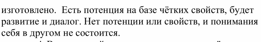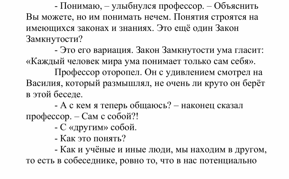 Человек находится в парадигме своего мышления, и не может увидеть в "другом" что-то новое. Само "понимание" всегда вчерашнее. Это происходит из того, что за "понимание" отвечает мир ума ("внутренний мир" в ТМ). Мир ума основан на памяти, сохраняющей впечатления в градации их для линейного двухполярного мышления в линейной шкале ценностей. Шкала эта самая примитивная в виде числовой оси, на которой каждый строит свое мировоззрения из того, что каждое событие, каждое впечатление имеет понятие "лучше-хуже", "правильно-неправильное", как "одно против другого". Шкала у каждого своя, но в своем качестве она одномерная, т.е. от минуса к плюсу и всегда можно выбрать, что "лучше", а что "хуже". И все споры идут только относительно того, что "лучше", а что "хуже", но не затрагивают примитивность и линейность самой шкалы ценностей. В этом закон замкнутости мышления, который абстрактно на уровне символов доказан в математике теоремой Гёделя о том, что непротиворечивость системы не доказывается средствами самой системы.