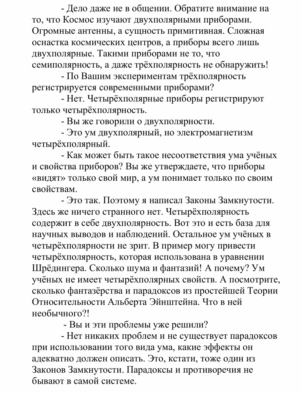 Это не совсем так. Ленский пишет как раз о соответствии двухполярного ума ученых и двухполярных приборов, ими созданных. Сам природный электромагнетизм Ленский называет четырехполярным, что ум ученого увидеть не в состоянии. Да что там четырехполярность, когда вся наука основана на половине двухполярности, где работает система эгоизма: ++ = + (например, "друг моего друга - мне друг") и не учитывает двухполярною зеркальную ей систему альтруизма, где ++ = -, "слишком хорошо - уже плохо".